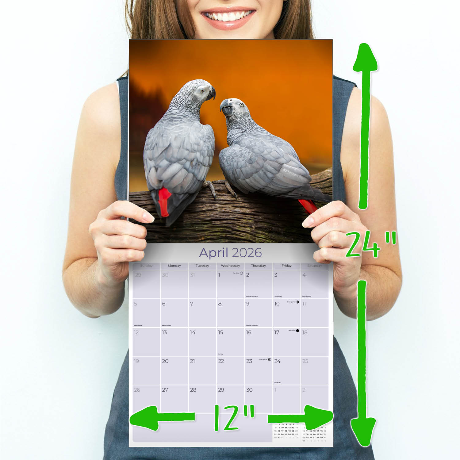 Parrots grace each month of the African Greys Calendar 2026. Each color photo reveals the intelligence and habits of this popular parrot. Keep track of the most important days of the year in the daily grids with enough space to record every occasion. This calendar is expertly printed with large photos in a 12 x 12 format.