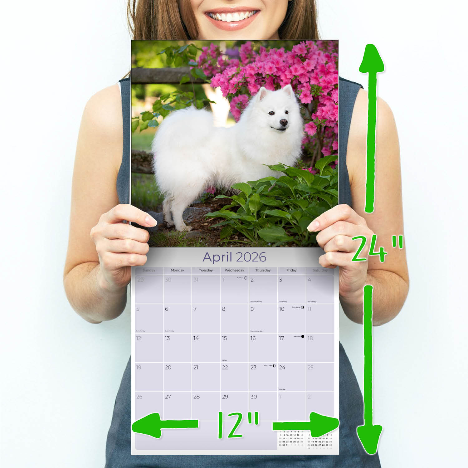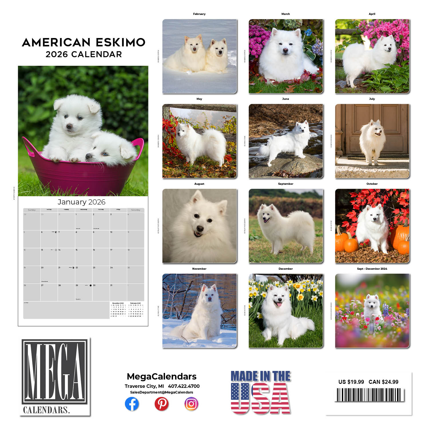 The American Eskimo Calendar 2026 captures the intelligent and friendly personalities of these bright white dogs. Stunning images are reproduced on heavyweight paper in a 12 x 12 format with individual daily grids perfect for writing in appointments and daily activities. Let these excellent watchdogs grace and organize your work space or home.