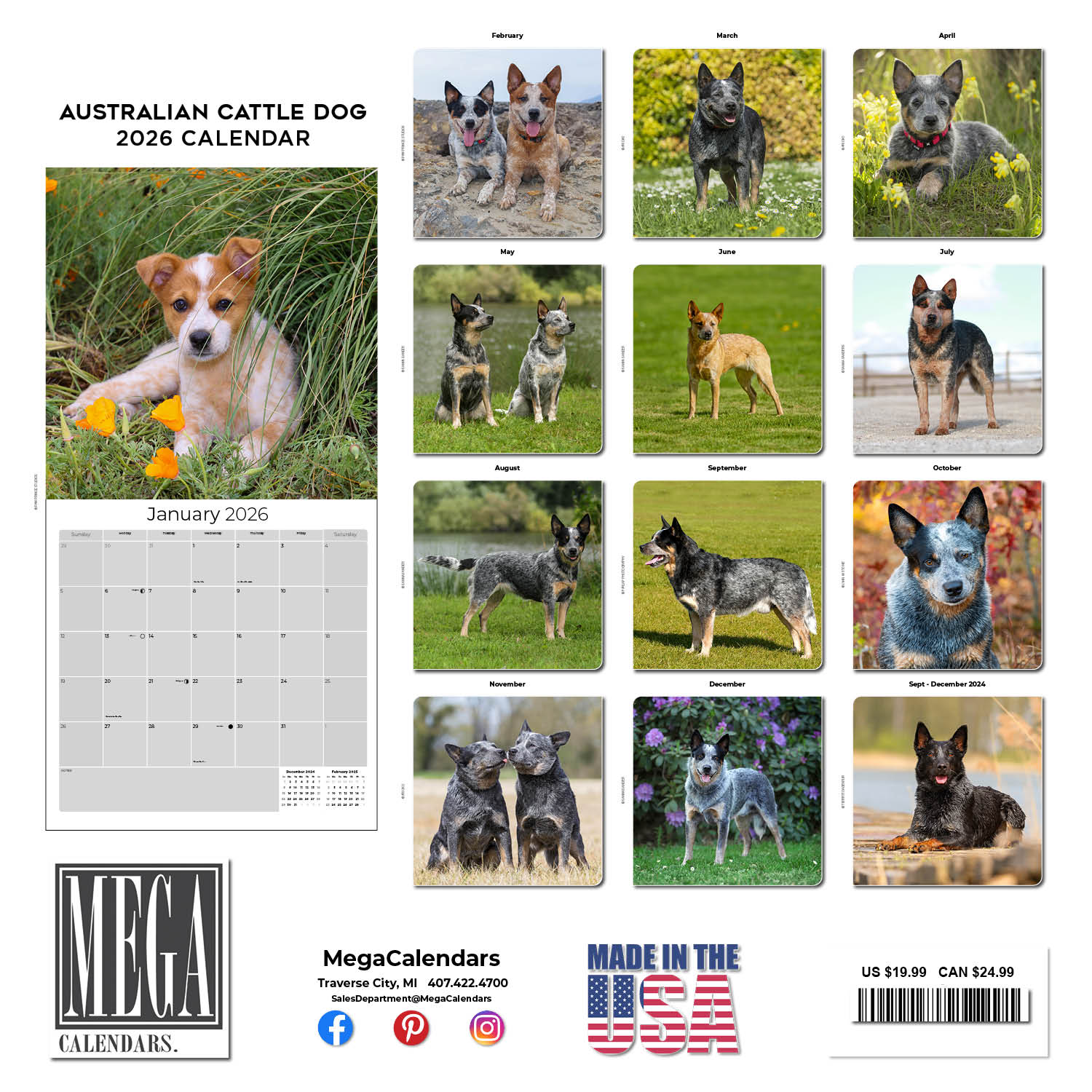 The Australian Cattle Dog Calendar 2026 is the perfect calendar for the herding dog fan in your family. Thirteen stunning photos of these strong and smart dogs are accompanied by large daily grids where you can record your appointments. The large 12 x 12 size makes a distinctive wall accessory at home or office.