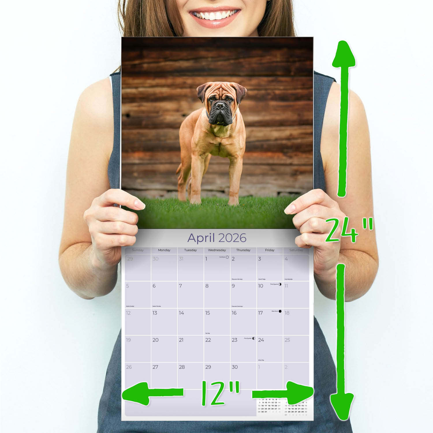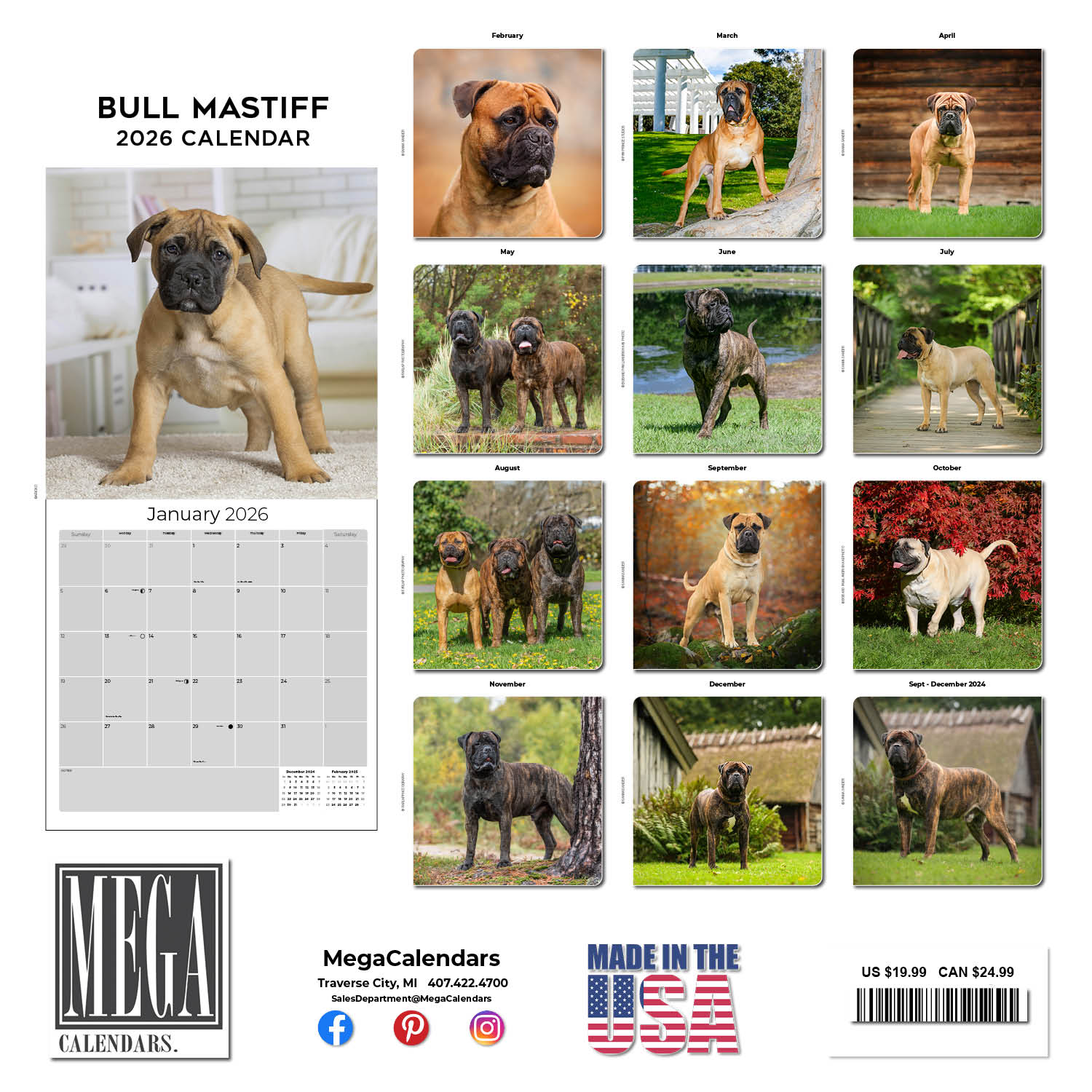 Showcasing their confidence and fearlessness, the Bull Mastiff Calendar 2026 is the perfect calendar for the dog lover in your home. Make every day an organized one with the large daily grids which are large enough for recording all your upcoming dates and appointment. This calendar has high-quality reproduction and is printed using green printing methods.