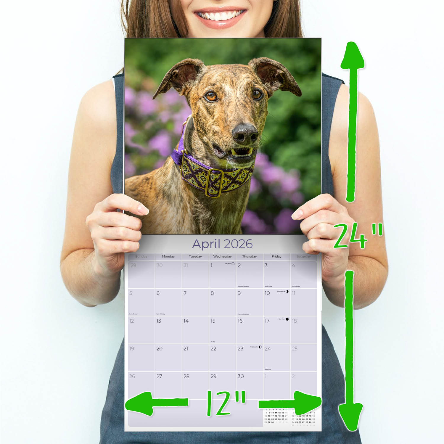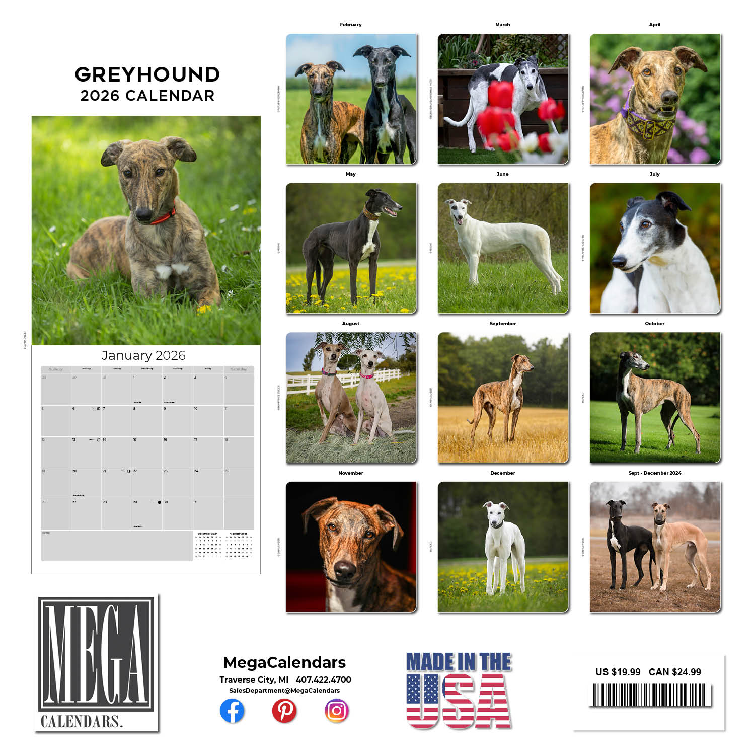 With thirteen amazing full color photographs, the Greyhound Calendar 2026 brings the speed and athleticism of the greyhound to your home or office. Each photo is accompanied by a monthly grid where you have enough room to record the details of all your appointments and special occasions. This calendar is printed using the latest green methods.
