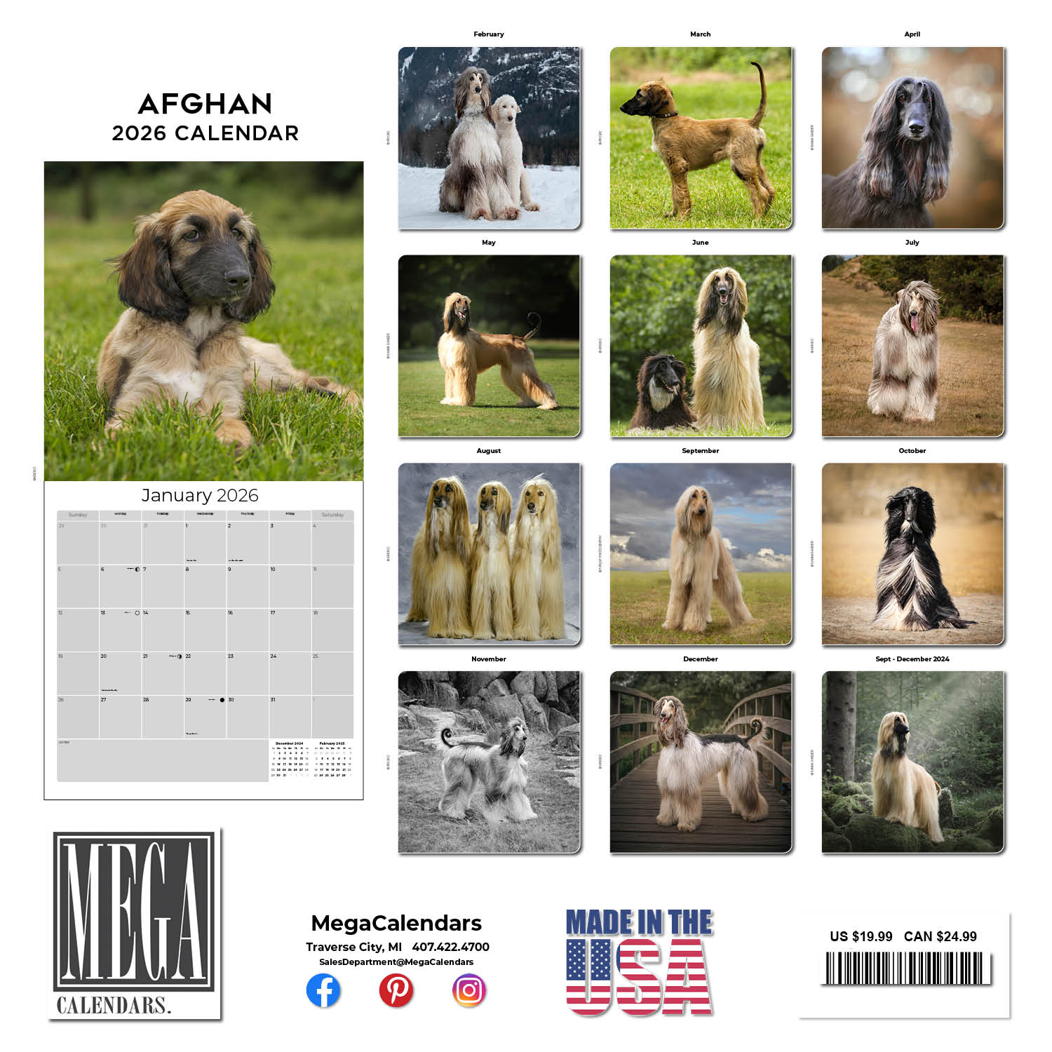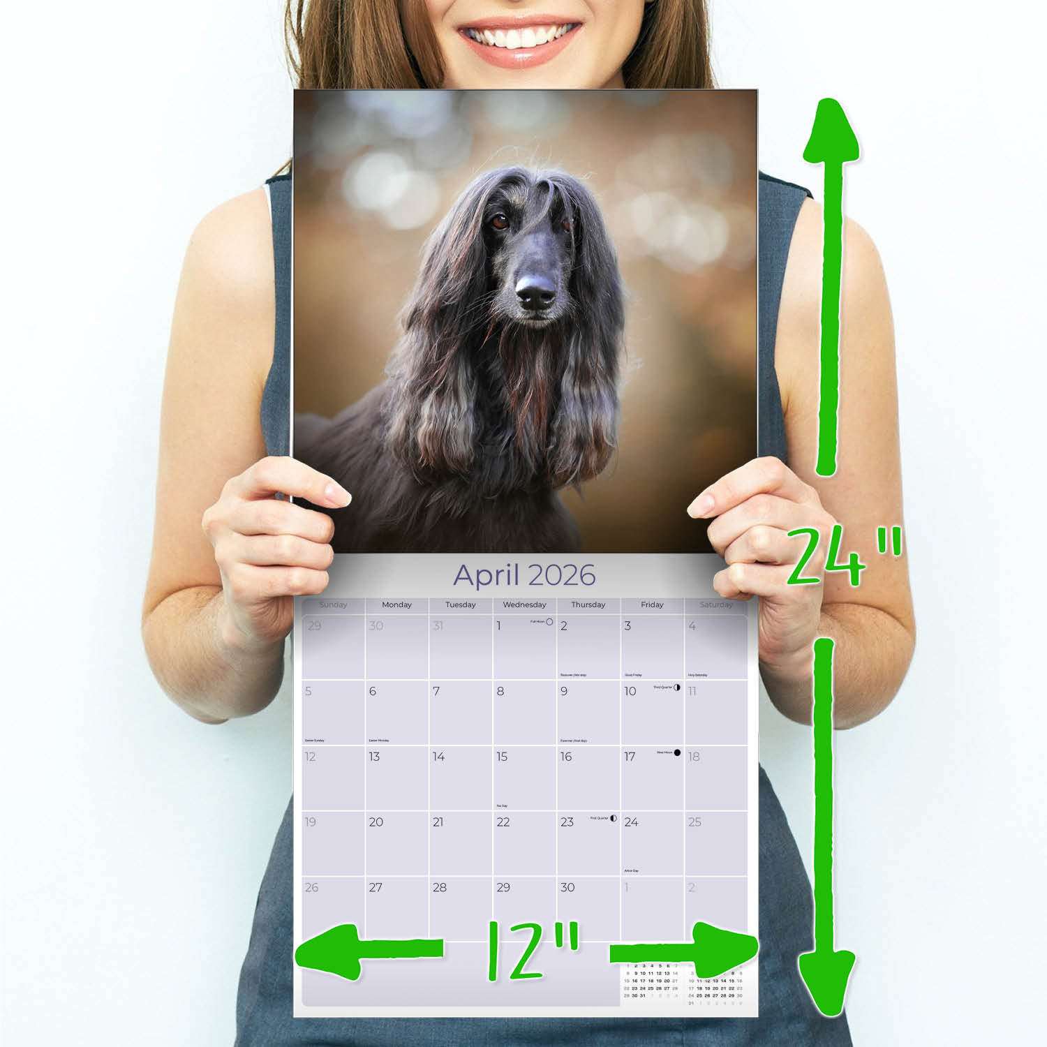 The Afghan Hound Calendar 2026 is the perfect calendar for the Afghan hound lover in your family. Thirteen stunning photos of these regal and independent dogs are accompanied by large daily grids where you can record your important appointments. The large 12 x 12 size makes a distinctive wall accessory at home or office.