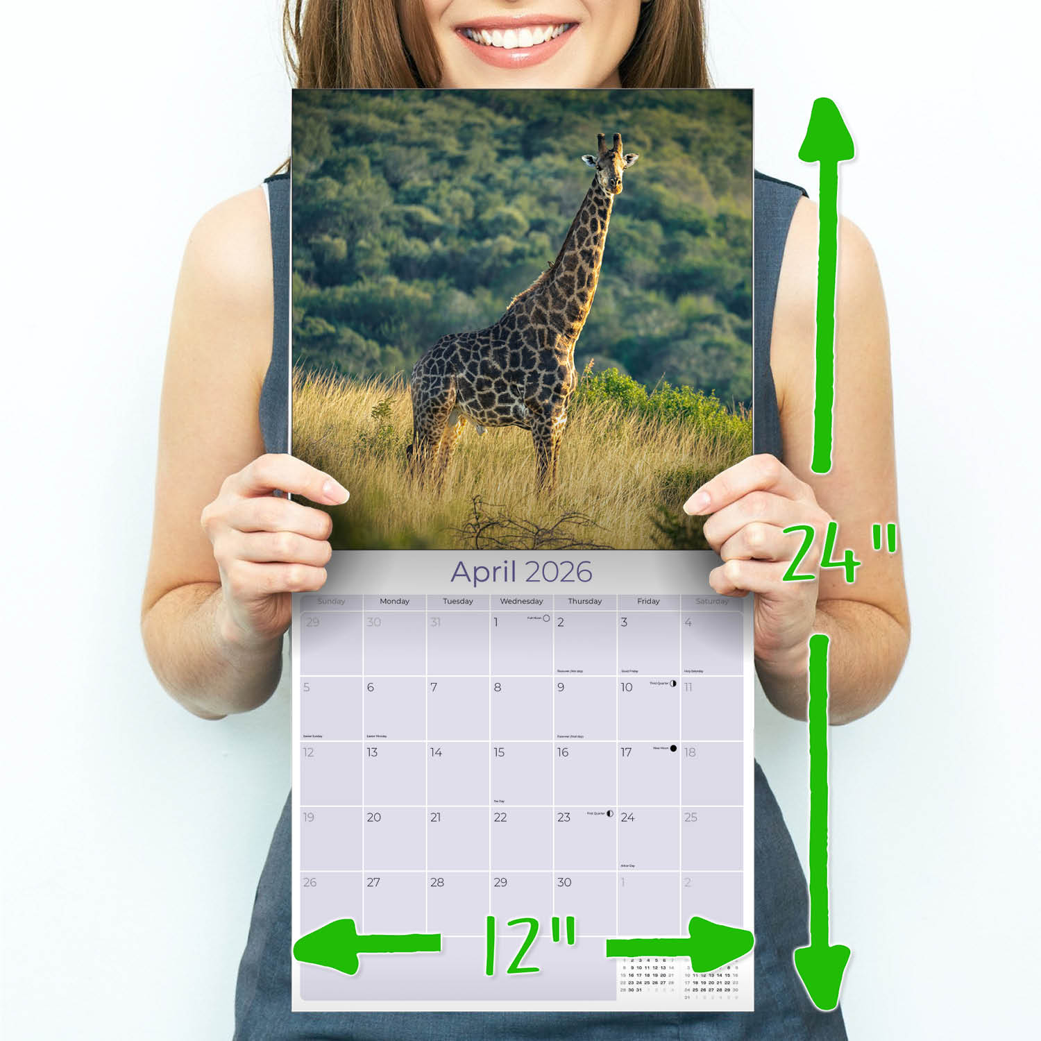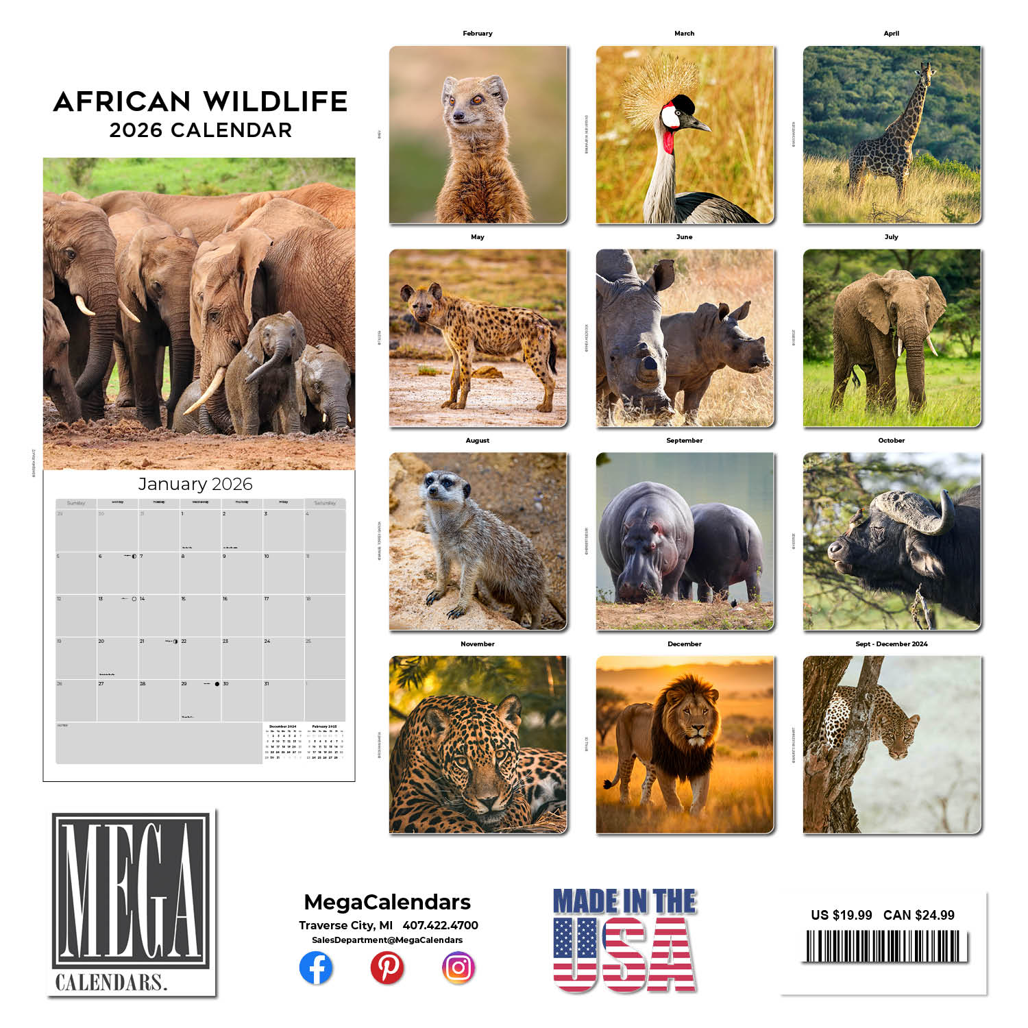 The savannahs, jungles and waterways of Africa provide the backdrops for the African Wildlife Calendar 2026. This calendar features each animal in vivid color photography and large 12 x 12 format. Each month has spacious daily grids to record your appointments and occasions. The wide variety of African animals featured on this calendar will complement your home or office decor.
