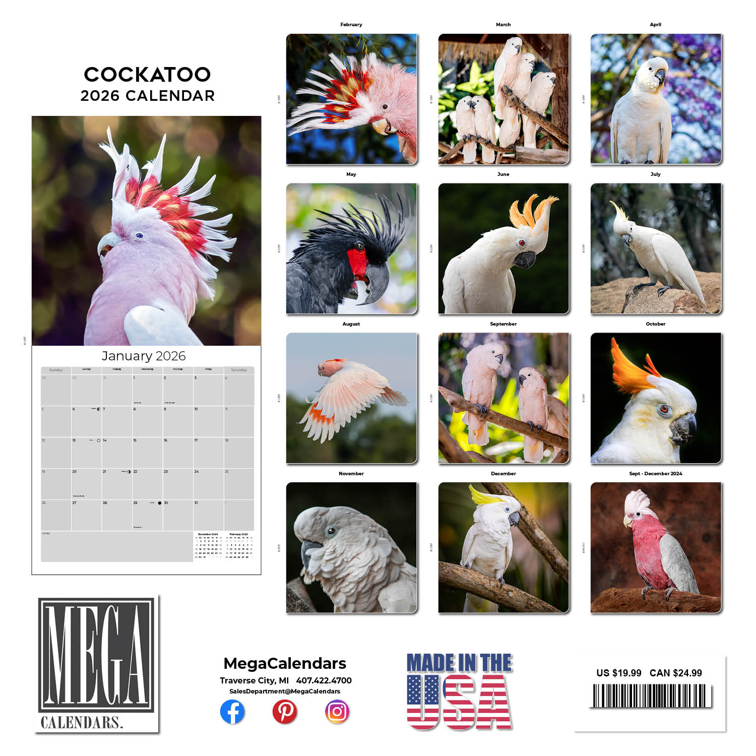 Best known for the curved bill and prominant crest the Cockatoo is the stars of the show in the Cockatoos Calendar 2026. Each playful pose reveals their engaging personalities and colorful plumage. Keep track of the important dates of the year in the daily grids with ample space to record every occasion. This calendar is expertly printed and suitable for home or workplace.