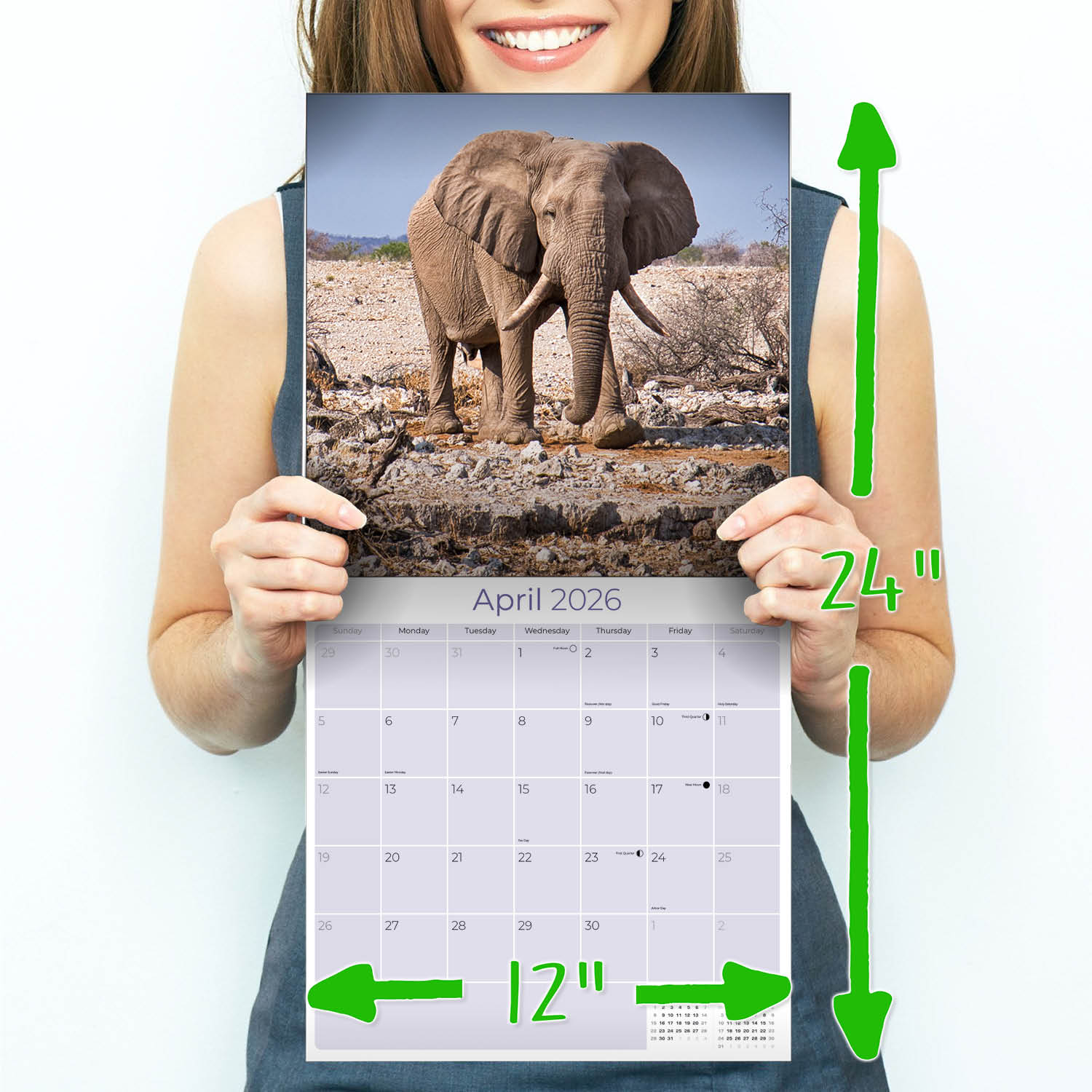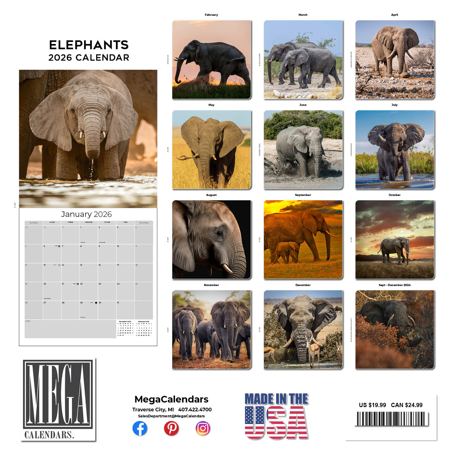 With thirteen photographs illustrating their lifestyles, the Elephants Calendar 2026 shows these large land mammals in their native habitats throughout the world. Use the spacious grids in this 12 x 12 wall calendar to keep track of important appointments, birthdays and anniversaries. Whether for home or office use, this calendar will make a delightful decorative accent.