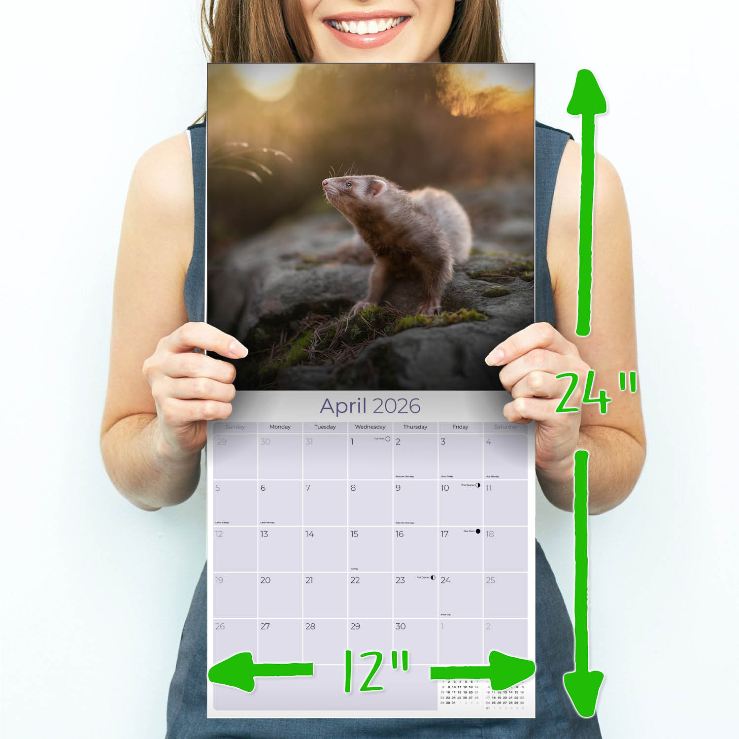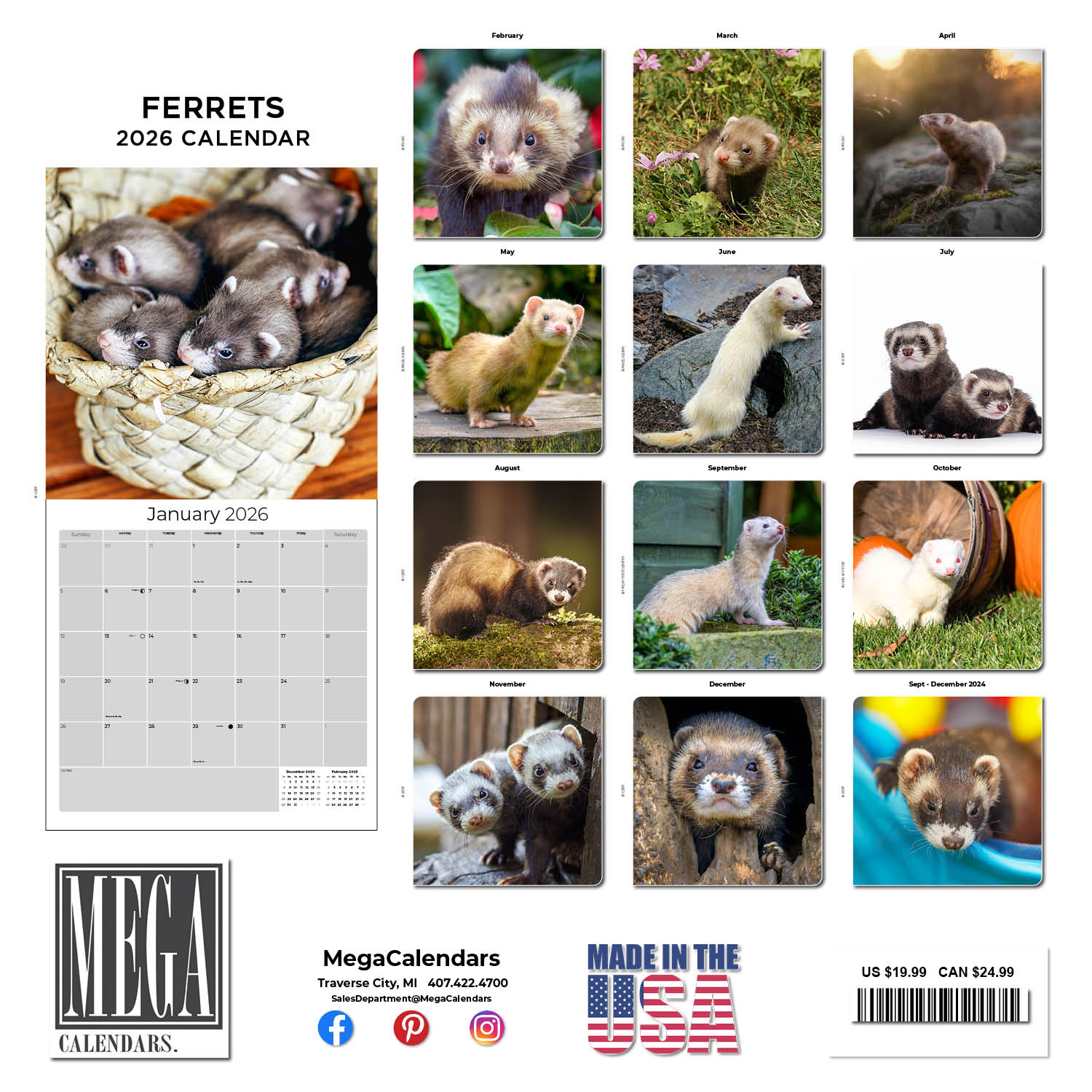 The antics of frolicking ferrets are featured in the Ferrets Calendar 2026. Each color photo reveals the energetic personalities of this adored pet. Keep track of the most important days of the year in the daily grids with enough space to record every occasion. This calendar is expertly printed with large photos in a 12 x 12 format.