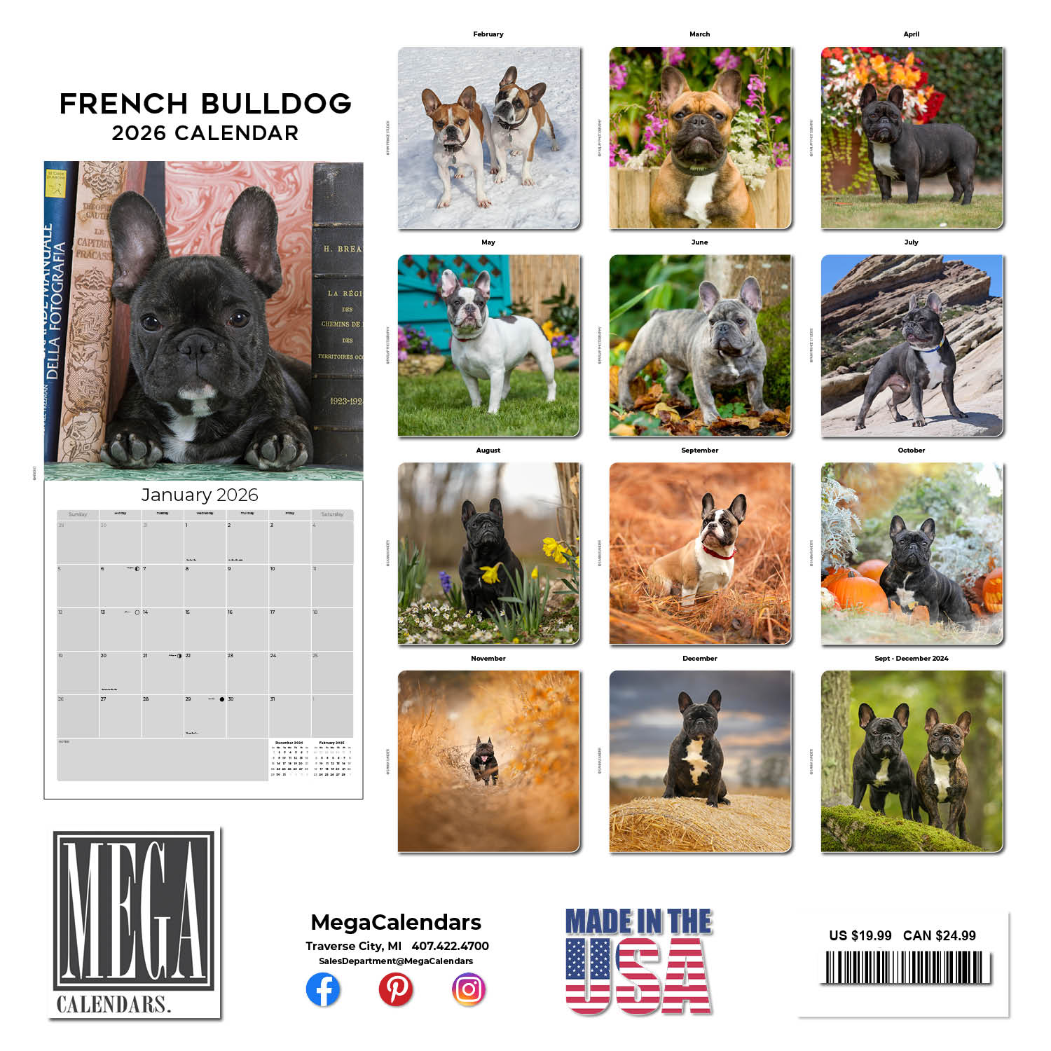 The large format of the French Bulldog Calendar 2026 captures the affectionate and alert nature of these dogs. You will find an open grid format ideal for entering the events that are important in your schedule. Thirteen color photos printed on quality paper make this wall calendar art for the home or office as well as an essential tool.