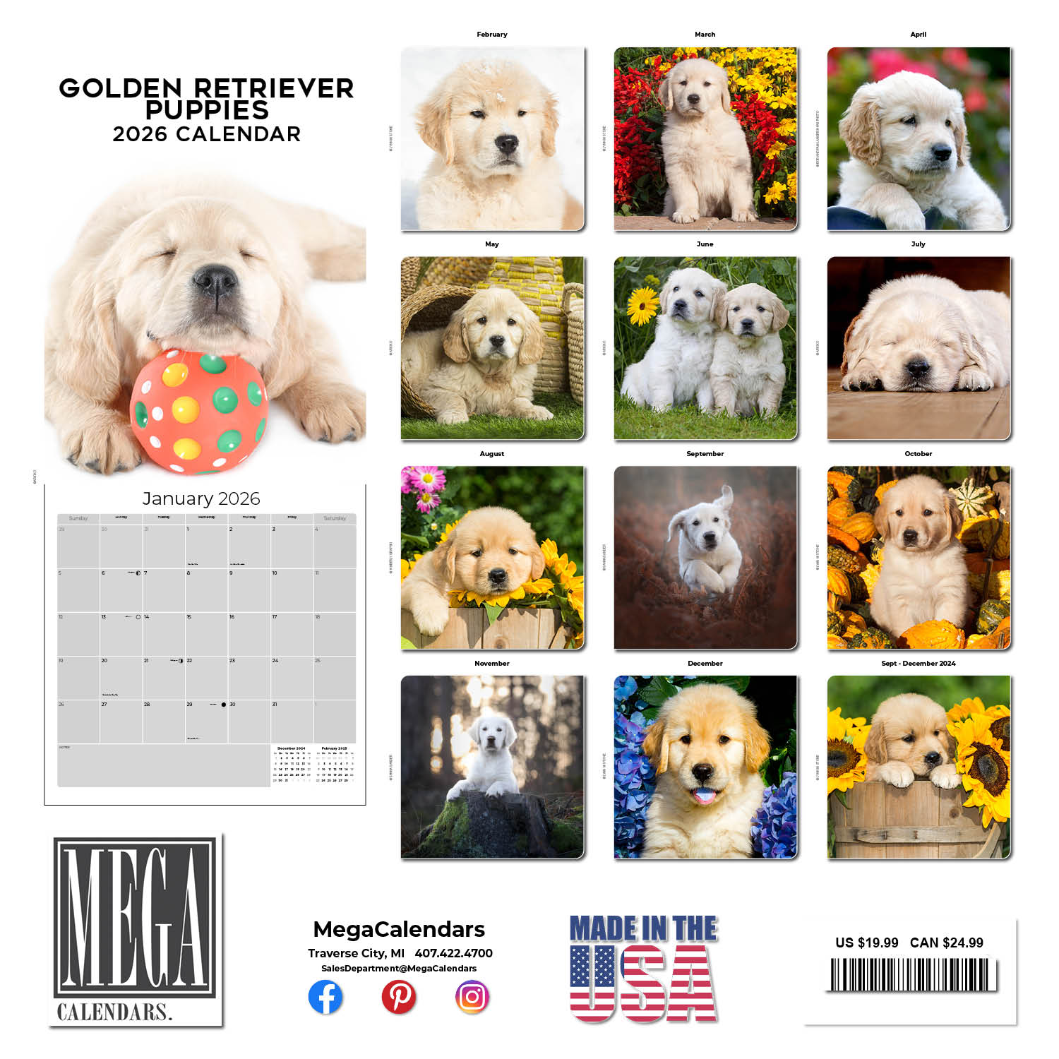 The perfect gift for dog fans everywhere, the Golden Retriever Puppies Calendar 2026 is a charming gallery of these playful pups. Use the spacious grids in this 12 x 12 calendar to keep track of important appointments and birthdays. Whether for home or office use, this calendar will make a delightful decorative accent.