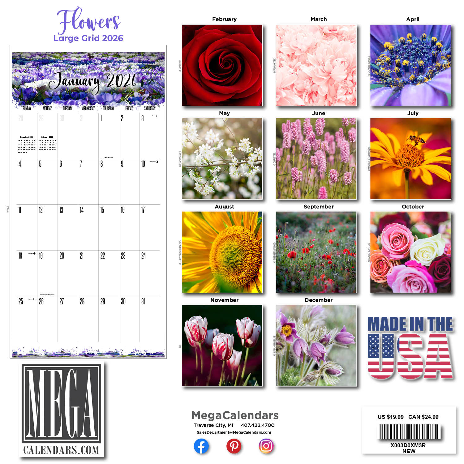 The Large Grid Flowers Calendar 2026 not only features fabulous photography sure to brighten your day, but also includes a wide open grid with ample space to jot down all of those special dates and anniversaries.
