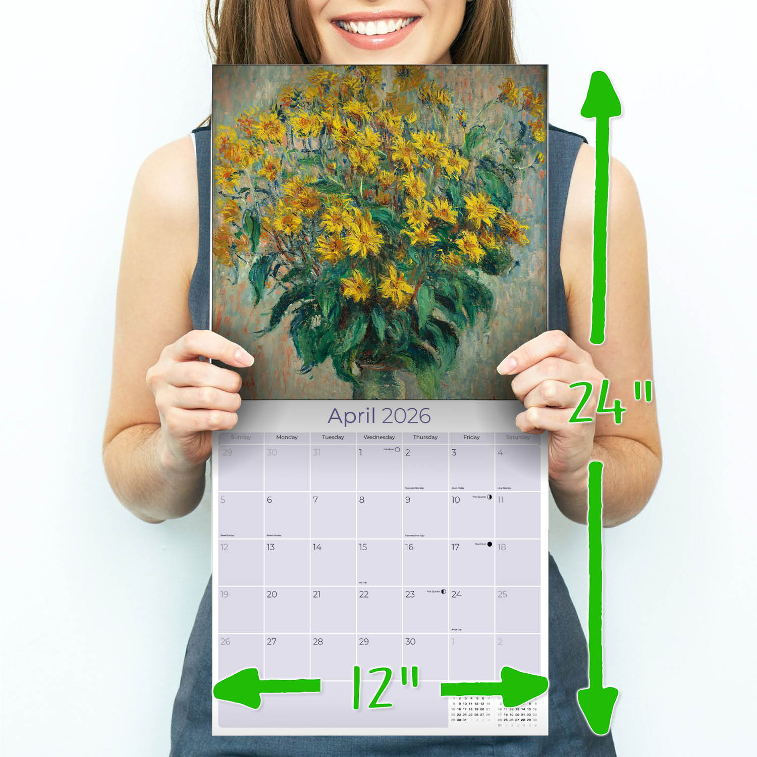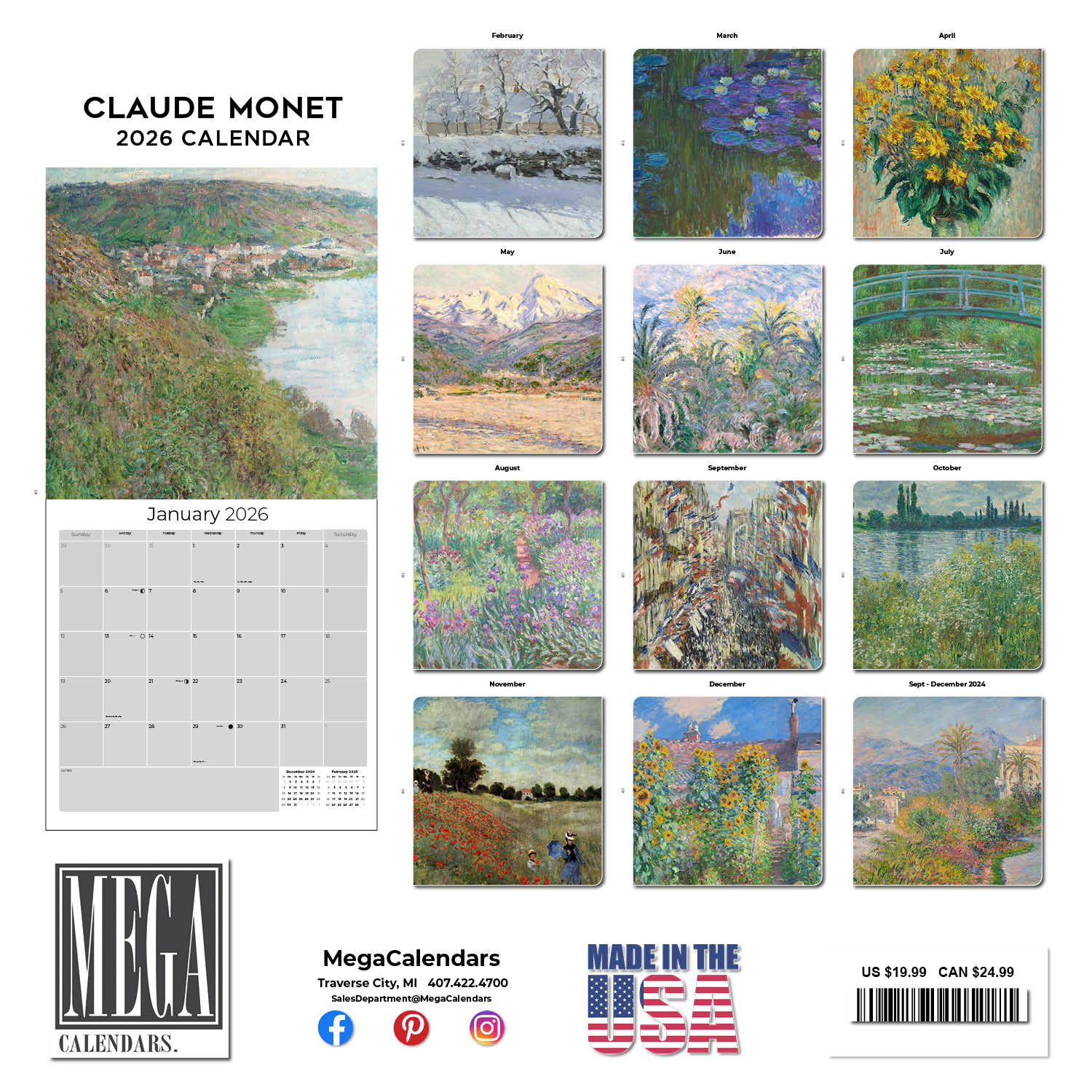 The large format of the Monet Calendar 2026 captures the majesty of Monets most famous paintings. You will find an open grid format perfect for entering all the dates and events that are important in your life. Thirteen full color photographs printed on quality paper make this Monet calendar art for the home as well as an indispensable daily tool.