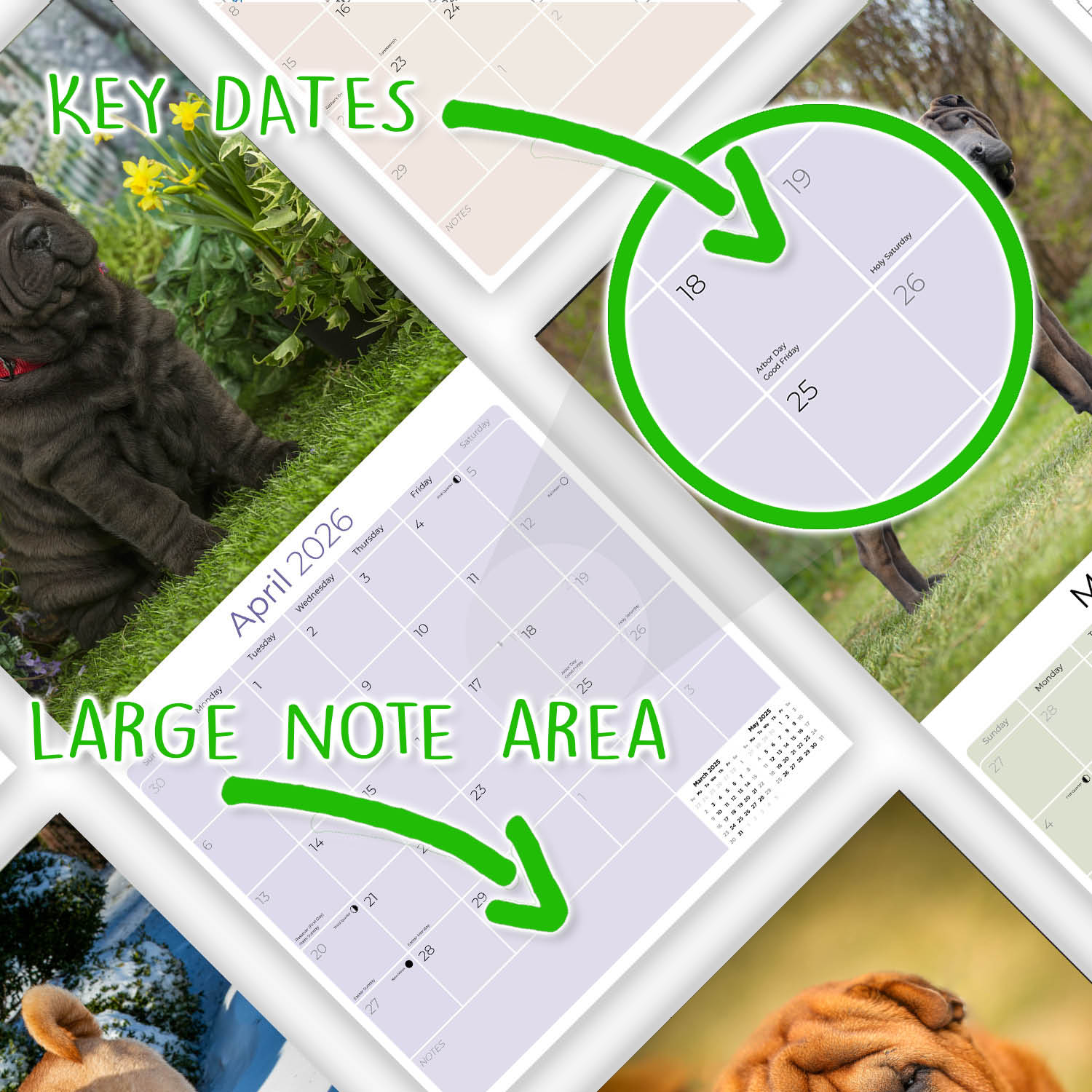 Shar Pei Calendar 2026 is a celebration of these wrinkled, devoted and smart pets. Thirteen adorable Shar Pei adults and puppies are presented for your enjoyment. You will also appreciate the large daily grids to record your upcoming appointments on this 12 x 12 calendar. Suitable for home or office, the Shar Pei calendar is printed using green methods.