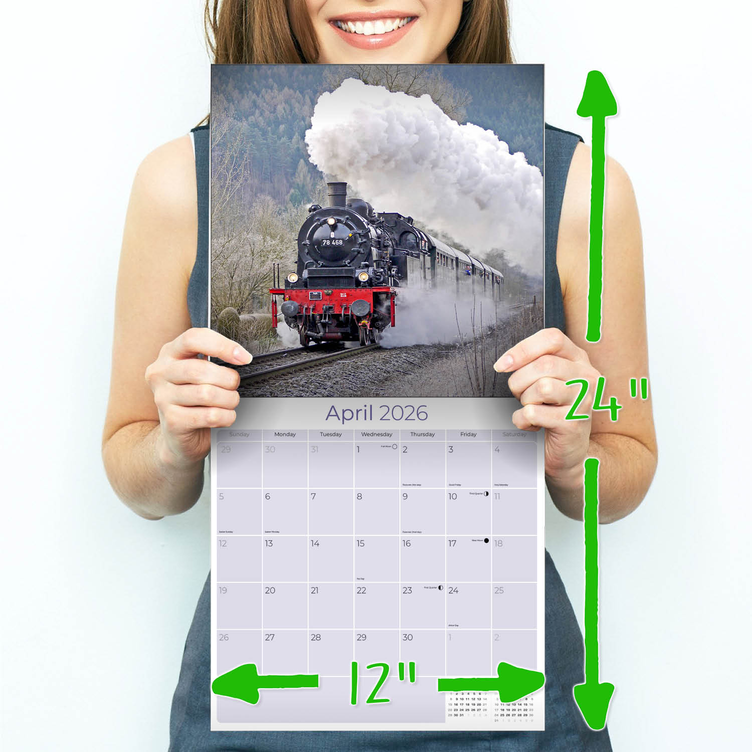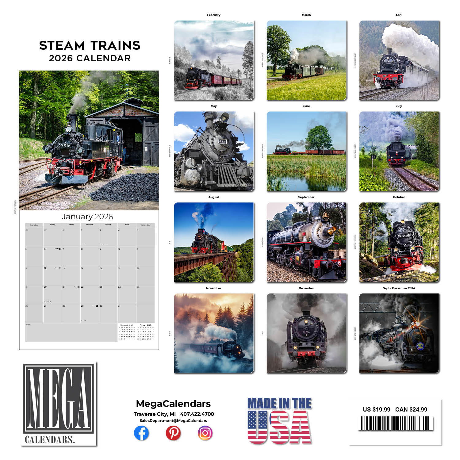 The perfect gift for fans of steam engines, the Steam Trains Calendar 2026 showcases these mighty machines in stunning full color photography. This calendar is a great organization tool with large grids that are spacious enough to enter all your upcoming appointments. Suitable for home or office, these art quality photos can be framed when the month is over.
