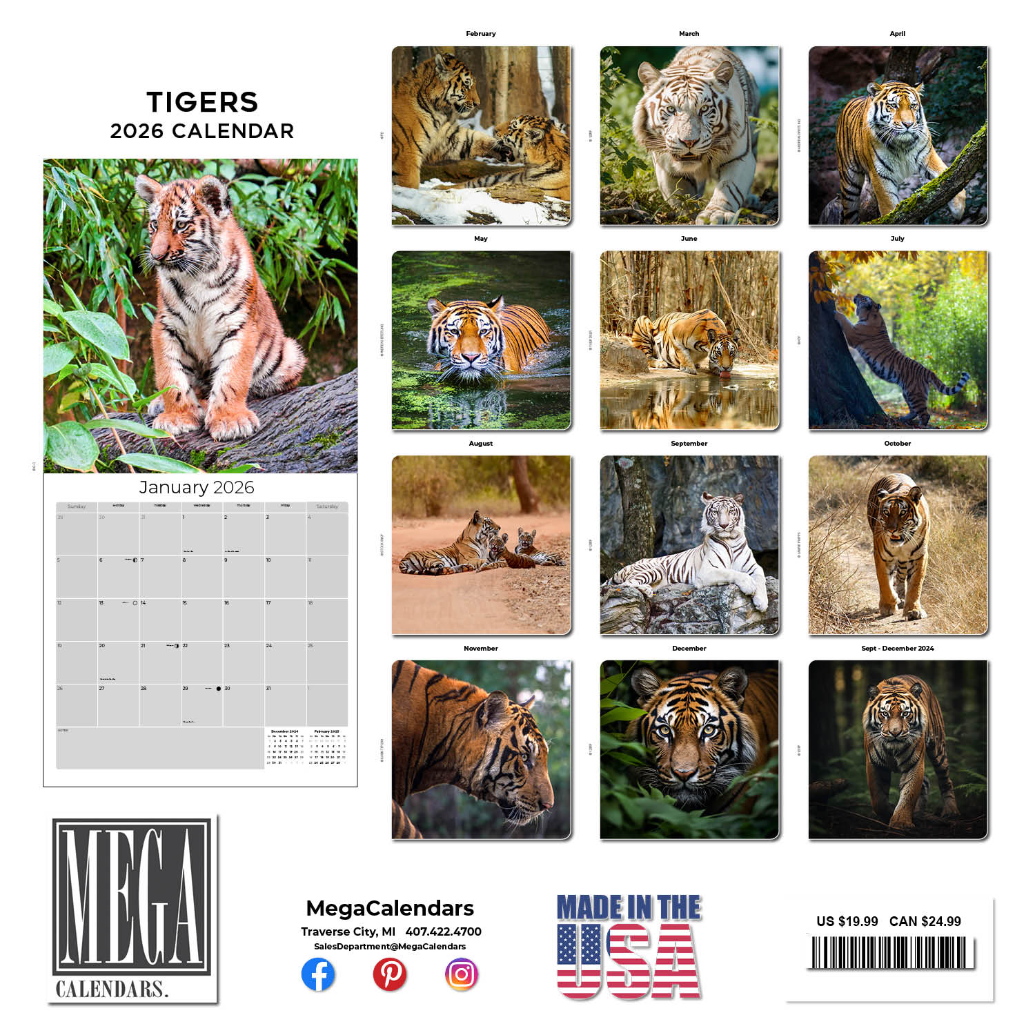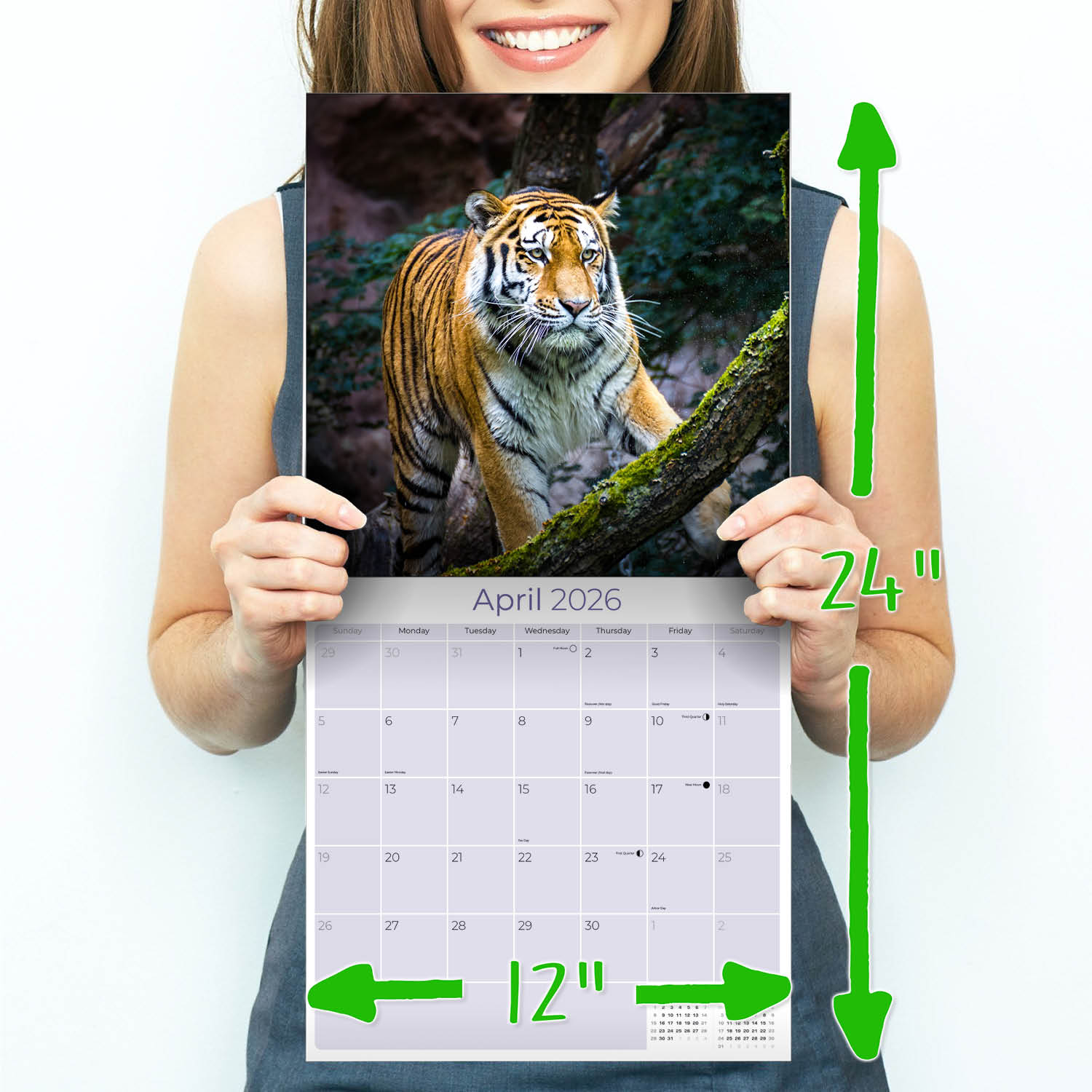The power and fierce pride of the tiger is beautifully captured in the Tigers Calendar 2026. Each month of the year, a stunning tiger photo is paired with daily grids where you can write in your upcoming celebrations and appointments. The Tigers Calendar 2026 makes an impressive decorative accent for your home or office space.