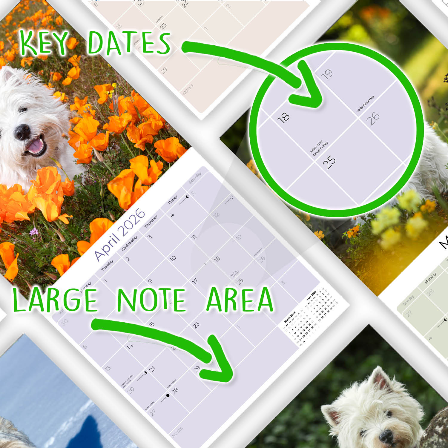 The large format of the West Highland Terrier Calendar 2026 captures the friendly and determined personality of these devoted family dogs. You will find an open grid format perfect for entering all the dates and events that are important in your life. Thirteen full color photographs printed on quality paper make this calendar art for the home as well as an indispensable daily tool.